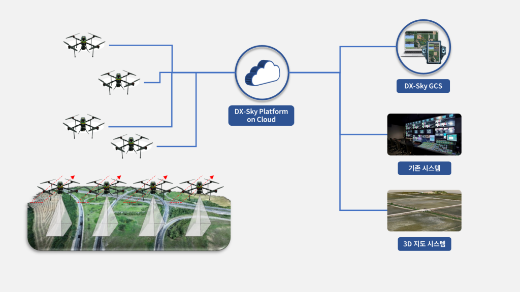 DX-Sky GCS Platform은 클라우드 기반의 드론 운용 플랫폼으로, 인터넷으로 연결된 다수의 드론들을 관제하기 위한 하나의 통합된 관제 환경을 제공합니다. 인증 절차를 통해 허가받은 사용자만 자신만의 안전한 공간에서 드론을 등록, 관리 및 운용할 수 있습니다.